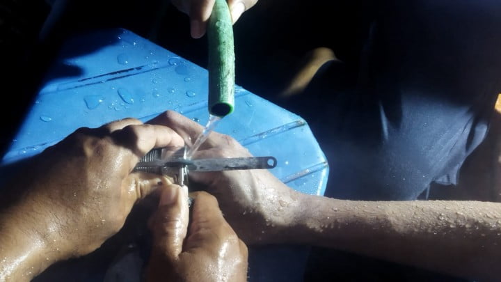 Dalam melakukan upaya penyelamatan, petugas memakai gergaji kecil supaya tidak melukai tangan pelapor.